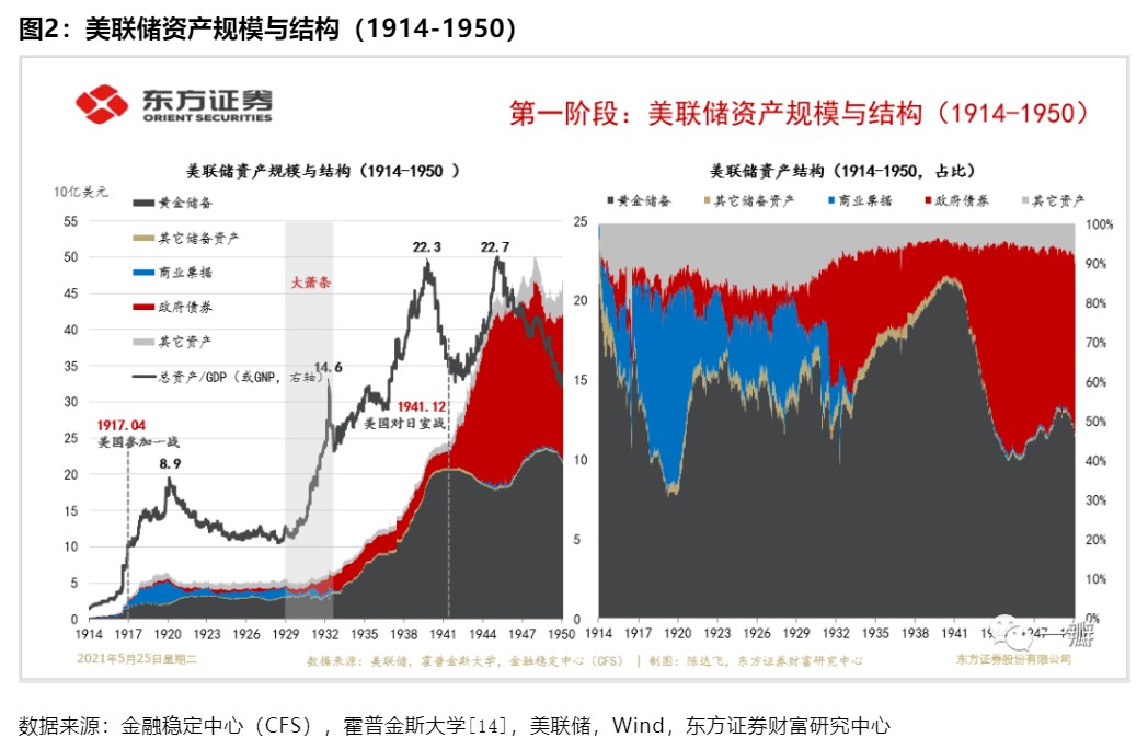 金本位是理解本阶段美联储货币政策和资产负债表的一个制度背景。1914年11月美联储正式成立时,总资产仅为2.5亿美元,占GNP的比重0.66%,其中,黄金储备2亿美元,占总资产的84%,约占世界黄金储备的五分之一。