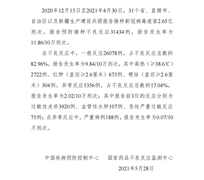 数据显示,2020年12月15日至2021年4月30日,31个省、自治区、直辖市以及新疆生产建设兵团报告接种新冠病毒疫苗2.65亿剂次,报告预防接种不良反应31434例,报告发生率为11. 86/10万剂次。