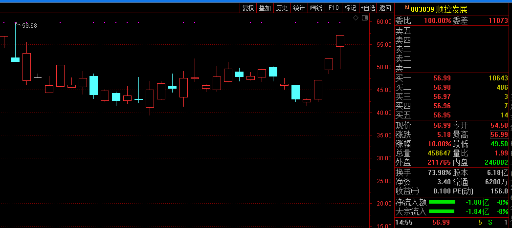 5月28日,顺控发展再度以涨停收盘,收报于56.99元,为连续3个交易日涨停,收盘价也创出历史新高,换手率更是高达惊人的73.98%。