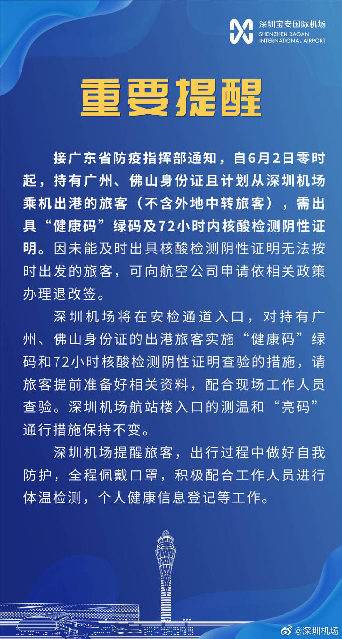据深圳机场消息,接广东省防疫指挥部通知,自6月2日零时起,持有广州、佛山身份证且计划从深圳机场乘机出港的旅客(不含外地中转旅客),需出具“健康码”绿码及72小时内核酸检测阴性证明。因未能及时出具核酸检测阴性证明无法按时出发的旅客,可向航空公司申请依相关政策办理退改签。