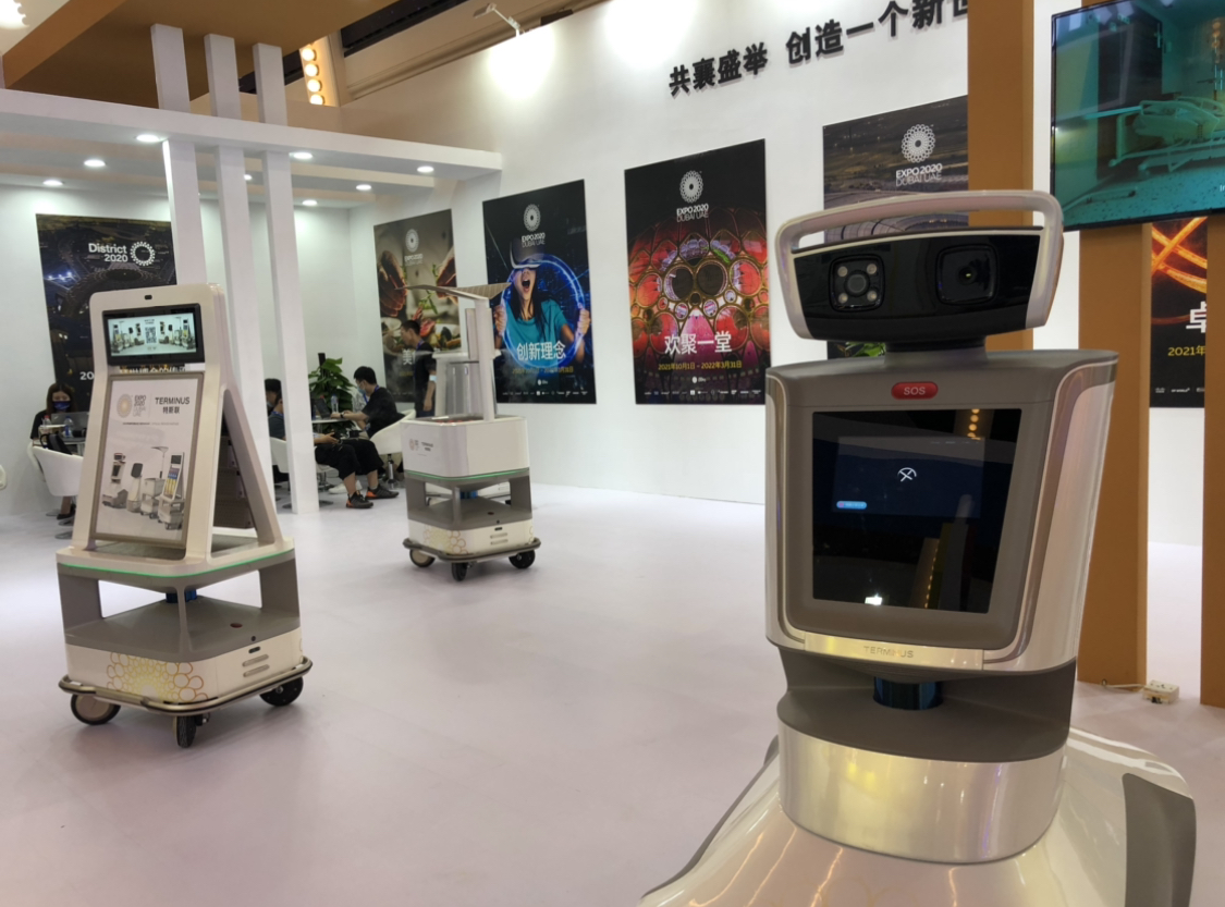 新冠疫情也推动了机器人在公共场所消杀等领域的普及。在本届大会的展区内,第一财经记者看到作为主宾国阿联酋国家馆的参展商及迪拜世博会官方合作伙伴,中国机器人公司特斯联发布的泰坦系列机器人活跃在场馆中,忙着“端茶送水”,还能进行封闭环境内的空气洁净。
