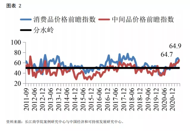 这种现象说明目前通胀预期已经相当明确了,而且由于基建等方面的繁荣,工业品的需求增多,这拉动了上游产品的价格,尤其是大宗商品的价格,由此导致了中间品价格前瞻指数的不断上升。