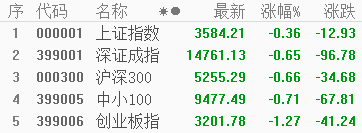 6月3日,A股三大指数集体低开,全天呈现冲高回落的态势。截至收盘,沪指下跌0.36%,报3584.21点;深成指下跌0.65%,报14761.13点;创业板指走势较弱,跌幅达到1.27%,报3201.78点。