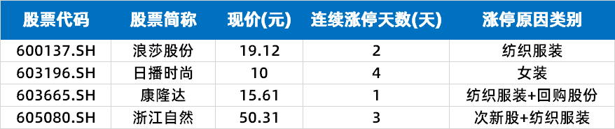 近期,纺织服装板块持续冲高,日播时尚(603196.SH)录得4连板,浙江自然(605080.SH)录得3连板。