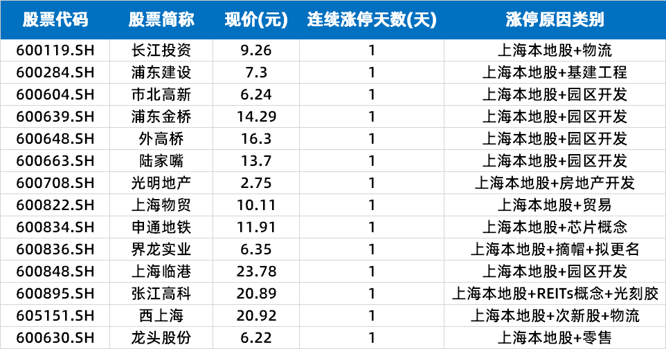上海本地股午后迅速拉升,张江高科(600895.SH)、上海临港(600848.SH)、浦东建设(600284.SH)等十余只个股集体涨停。