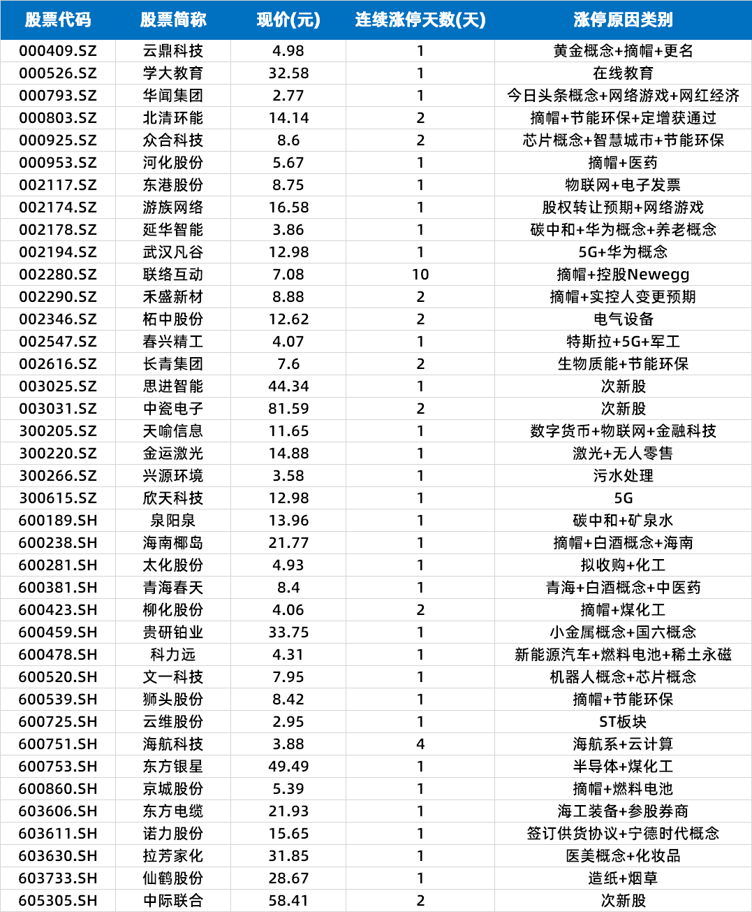 按行业来看,其他涨停个股零星分布于5G、白酒、半导体、环保等板块。