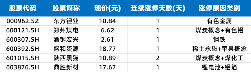 近日焦煤、铁矿石等大宗商品价格反弹,钢铁、煤炭、有色等顺周期概念随之活跃。个股方面,陕西黑猫(601015.SH)、酒钢宏兴(600307.SH)、盛和资源(600392.SH)等涨停,其中陕西黑猫2连板。