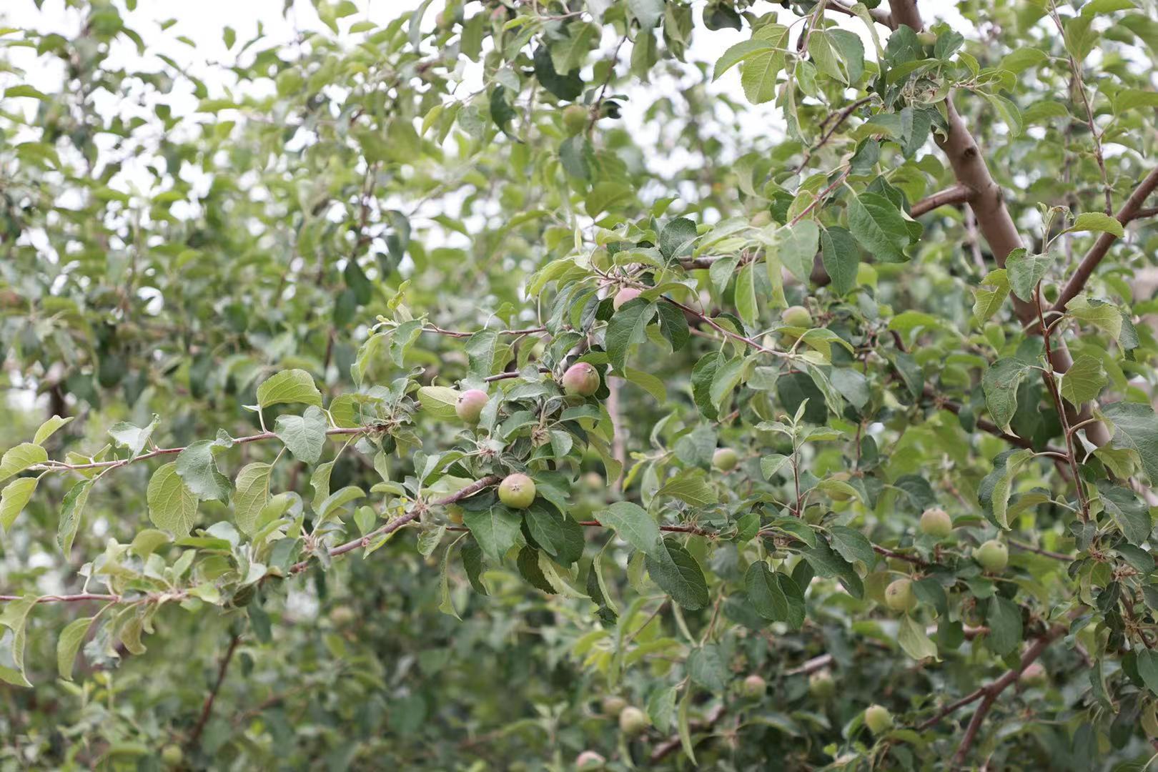 延安市富县交道镇苹果园坐果一个月的果树。