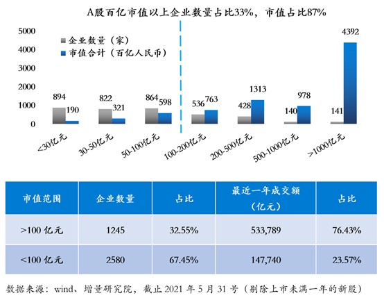 而中国资本市场,企业价值分化也正在向“一九分化”演变。目前A股百亿市值以上的企业占到33%,这些企业占据着A股市场87%的市值以及76%的近一年成交量。今后的A股将持续向“一九分化”演变,资金将会重点流向行业头部企业,那些非行业头部企业将逐渐丧失资金的关注度,从而丧失资本价值。