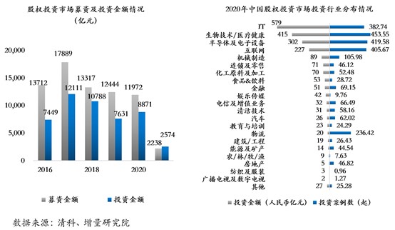 其次,从一级市场投资情况来看,虽说从2018年开始中国股权投资市场进入资本寒冬,但是在IT、生物技术/医疗健康、半导体及电子设备、互联网这些硬科技领域始终是投资资金最集中的地方,2021年第一季度,四个行业加起来的投资总量占总资金量的72.18%。注册制时代下,企业上市的核心是满足实现市场化市值的要求,而反映市场化市值最好的指标,就是一级市场的投资机构给予企业的估值判断。