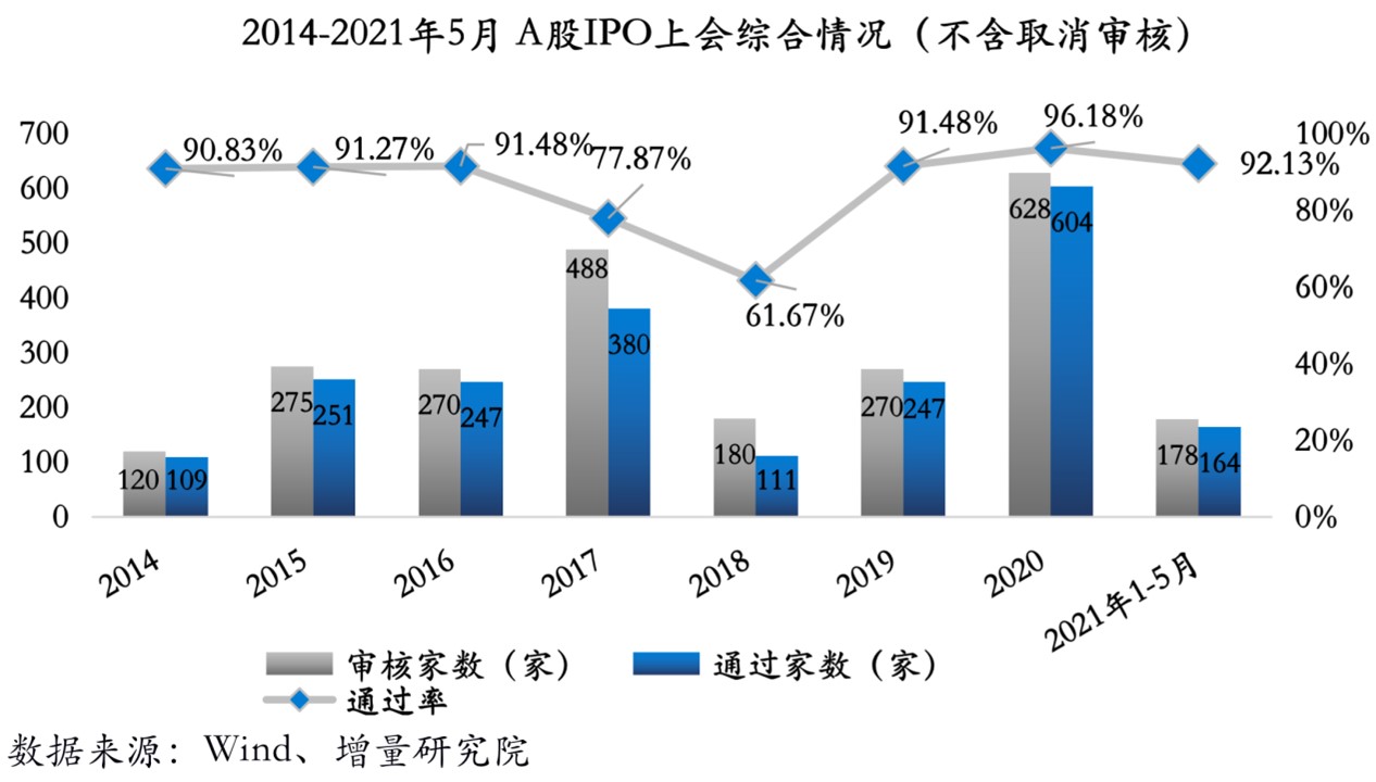 自2019年7月22日科创板试点注册制正式落地,资本市场开启全面注册制改革后,企业上市“开口”得以打开,A股IPO企业数量持续回升。2020年,共计604家企业过会,达到了过往十年过会企业数量历史新高。2021年1-5月,因中介机构尚未具备与注册制相匹配的理念等原因,审核以及过会数量产生了小幅下滑,而伴随着市场参与方更加理性,下半年的审核及过会数量将会逐渐回升。从数据上看,即便是前5月的累计过会数量也远超以往核准制阶段平均年度过会数量的一半。