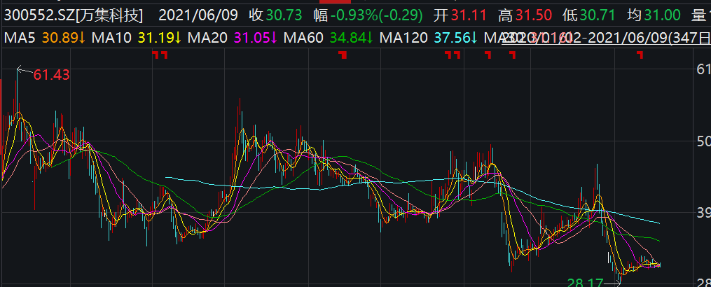 万集科技股价登顶后,股价下跌的观感看上去要比金溢科技缓和不少。截至6月9日收盘报30.79元。