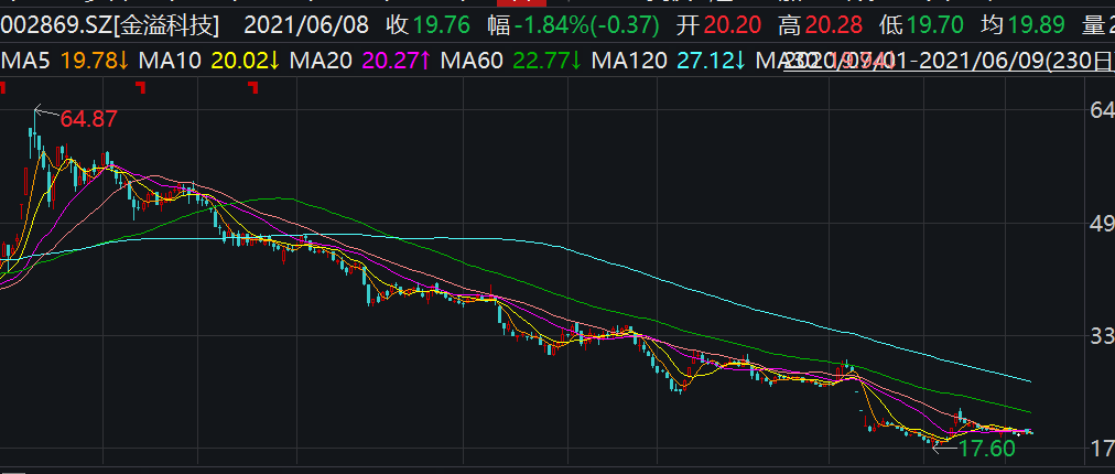 两家公司的股价在到达顶峰也开始下跌。金溢科技截至6月9日的收盘价为19.49元,股价下跌的画风是这样的: