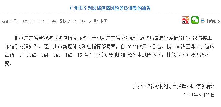据广州市卫生健康委员会网站消息,根据广东省新冠肺炎防控指挥办《关于印发广东省应对新型冠状病毒肺炎疫情分区分级防控工作指引的通知》,经广州市新冠肺炎防控指挥部同意,自2021年6月13日起,广州市南沙区珠江街道珠江西一路(142、144、146、148、150号)由低风险地区调整为中风险地区。其他地区风险等级不变。