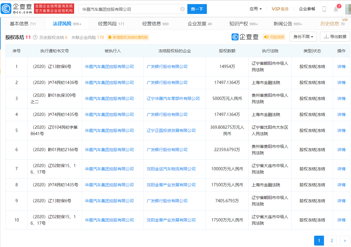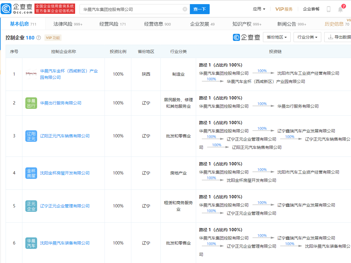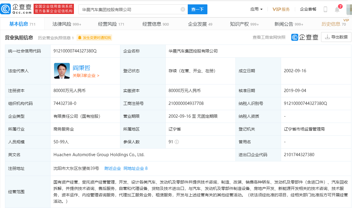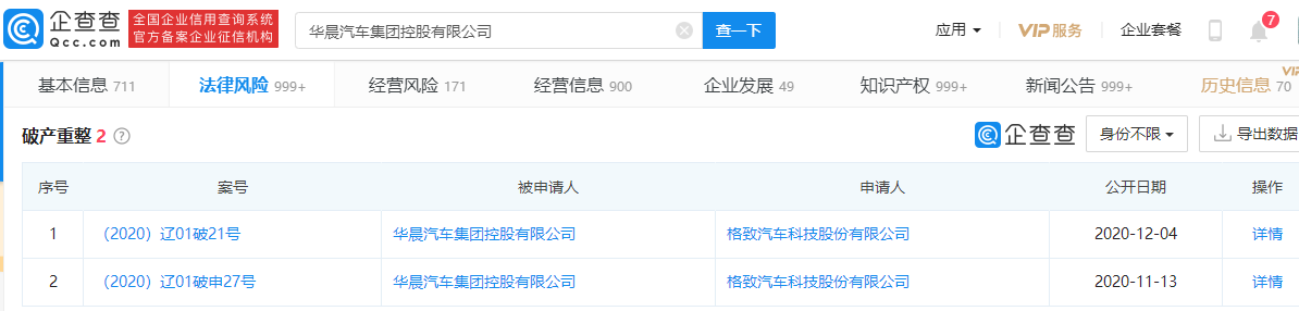 企查查显示,华晨汽车已被申请破产重整。4月20日,华晨汽车等12家企业实质合并重整案第一次债权人会议通过全国企业破产重整案件信息网召开。