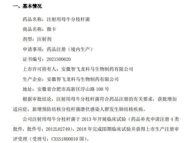 6月16日,智飞生物晚间公告,公司自主产品注射用母牛分枝杆菌,取得国家药监局下发的药品注册证书。