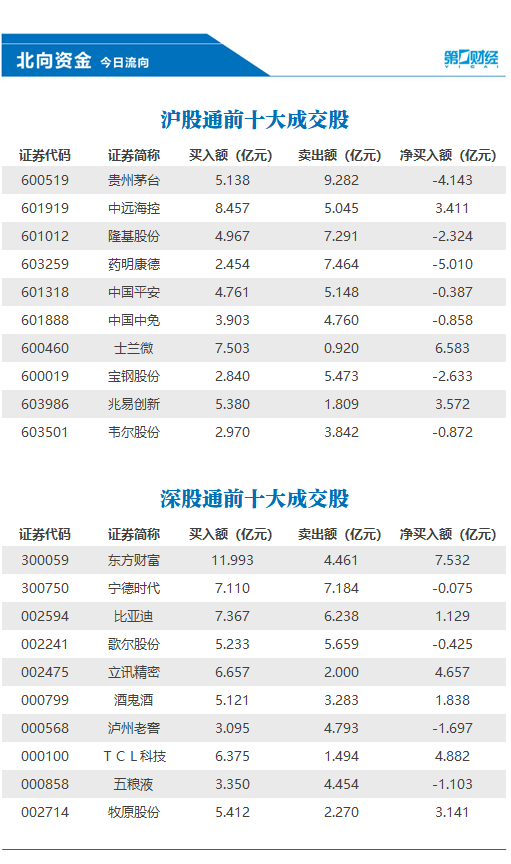 今日前十大成交股中,净买入额居前三的是东方财富、士兰微、TCL科技,分别获北向资金净买入7.53亿元、6.58亿元、4.88亿元。