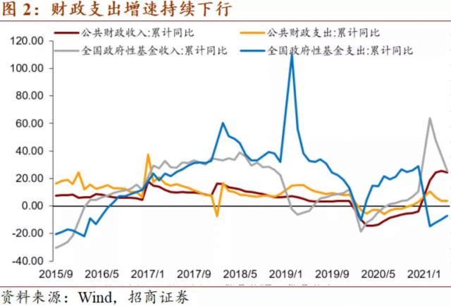 公共财政收入节奏较快,公共财政支出节奏较慢。1-5月全国一般公共预算收入累计9.6万亿元,同比增长24.2%。1-5月公共财政收入已完成全年预算的48.8%,较去年同期提高5.7个百分点,较2019年提高2.1个百分点。1-5月全国一般公共预算支出累计9.4万亿元,同比增长3.6%。1-5月公共财政支出已完成全年预算的37.4%,较去年提高1个百分点,较2019年下降2.1个百分点。