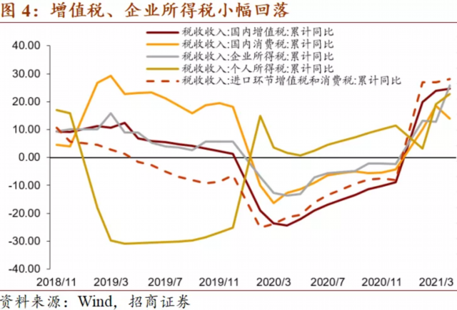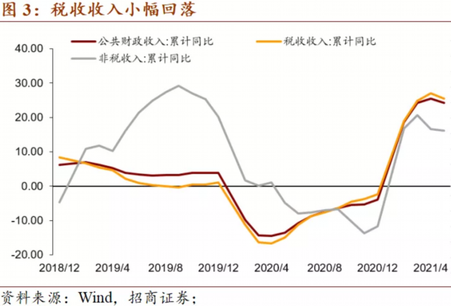 1-5月全国一般公共预算收入累计96454亿元,同比增长24.2%。其中,中央一般公共预算收入4.6万亿元,同比增长27%;地方一般公共预算本级收入5.1亿元,同比增长21.7%。税收收入增速25.5%,非税收入增速16.2%。税收收入中,增值税、企业所得税增速小幅回落,但仍维持高位增长;消费税、个人所得税、资源税等增速上升。