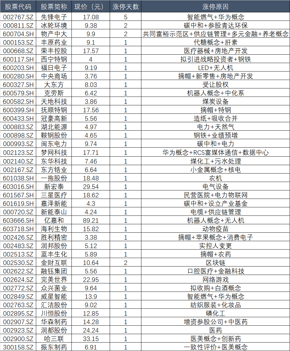 其他涨停股,零星分布于电力、碳中和、医美等题材中。