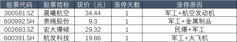 军工板块21日盘中走势强劲,晨曦航空(300581.SZ)、贵绳股份(600992.SH)、航发科技(600391.SH)等涨停。