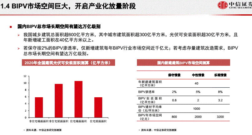 中信证券指出,虽然BIPV组件安装成本略高于传统组件,但BIPV屋顶功率密度更高且25年以上寿命远超彩钢瓦屋顶的10-15年,BIPV屋顶可在6年内回收投资,性价比已逐步超过传统BAPV屋顶,且更美观。我国城乡建筑总面积超600亿平方米,其中城市建筑面积超300亿平方米,光伏可安装面积超30亿平方米,年新增竣工面积在40亿平方米以上。国内BIPV总市场长期空间有望达万亿级别。