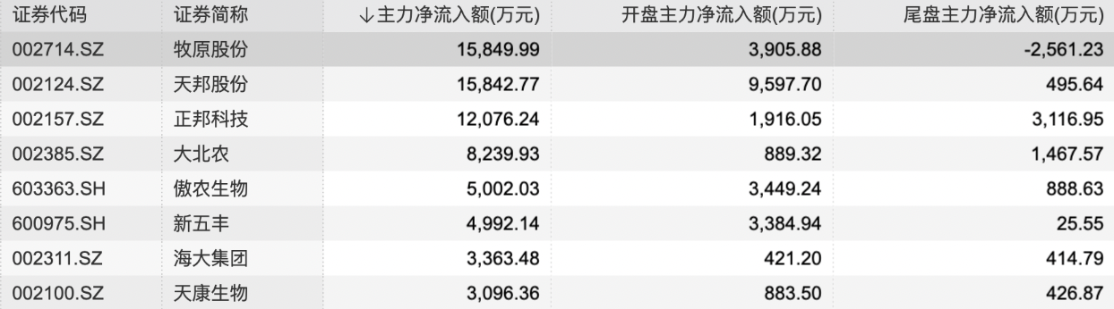 今日猪肉股大幅拉升,板块收涨4.65%,新五丰、傲农生物、天邦股份涨停。从盘后数据来看,主力净流入天邦股份1.58亿元、正邦科技1.21亿元、大北农8240万元、傲农生物5002万元。