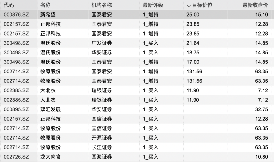 进入5月以来,机构给出猪肉股16次最新买入评级,其中10只目标价获公布,温氏股份获最高目标价21.64元,新希望获目标价25元,均较今日收盘价有较大涨幅空间。