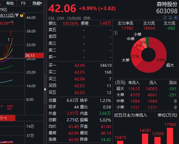 截至今日收盘,森特股份再度涨停,报42.06元,该股收获五连板,累计大涨61.03%。