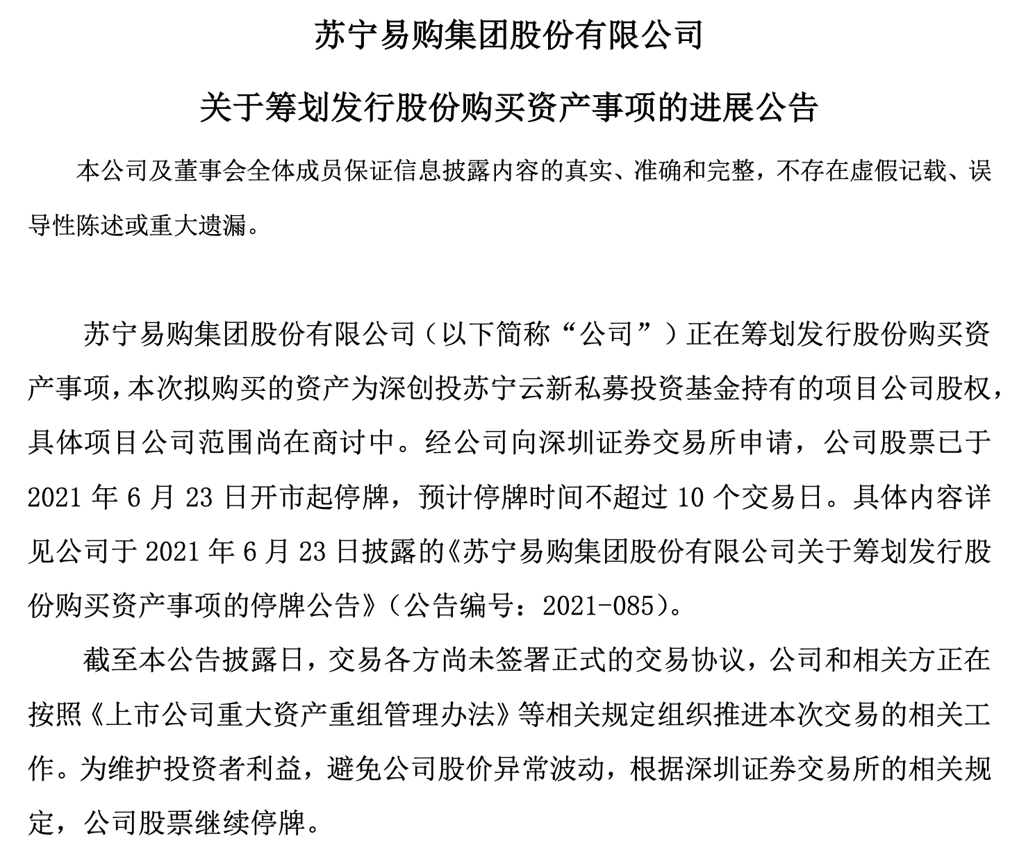 6月22日,苏宁易购再次发布公告称,公司正筹划发行股份购买资产事项,具体项目公司范围尚在商讨中。公司股票将自2021年6月23日停牌。