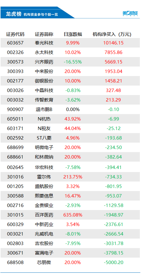 当天机构净买入前三的股票分别是春光科技、永太科技、兴齐眼药,净买入金额分别是1.01亿元、7856万元、5669万元。