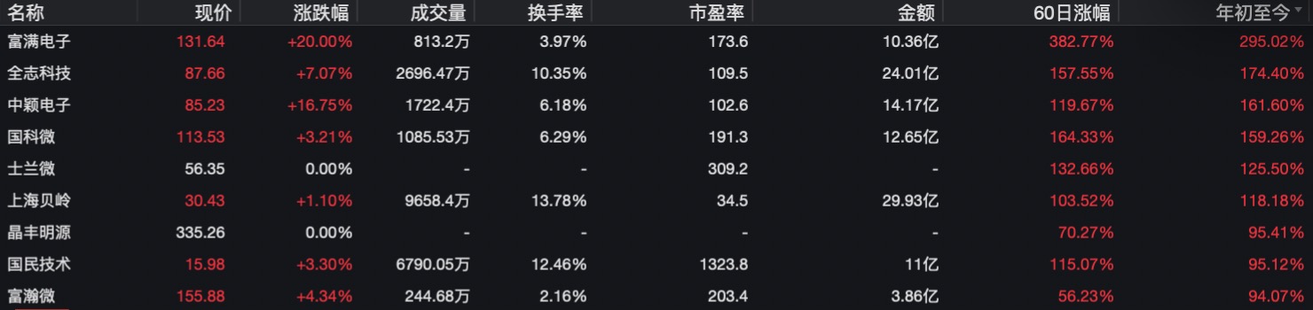 受中报预喜消息影响,半导体概念股今日集体大涨,据回顾,上半年,半导体板块上涨23.83%,涨幅最大的是富满电子,累计上涨295.02%,全志科技、中颖电子、国科微、士兰微、上海贝岭累计涨幅超过100%。