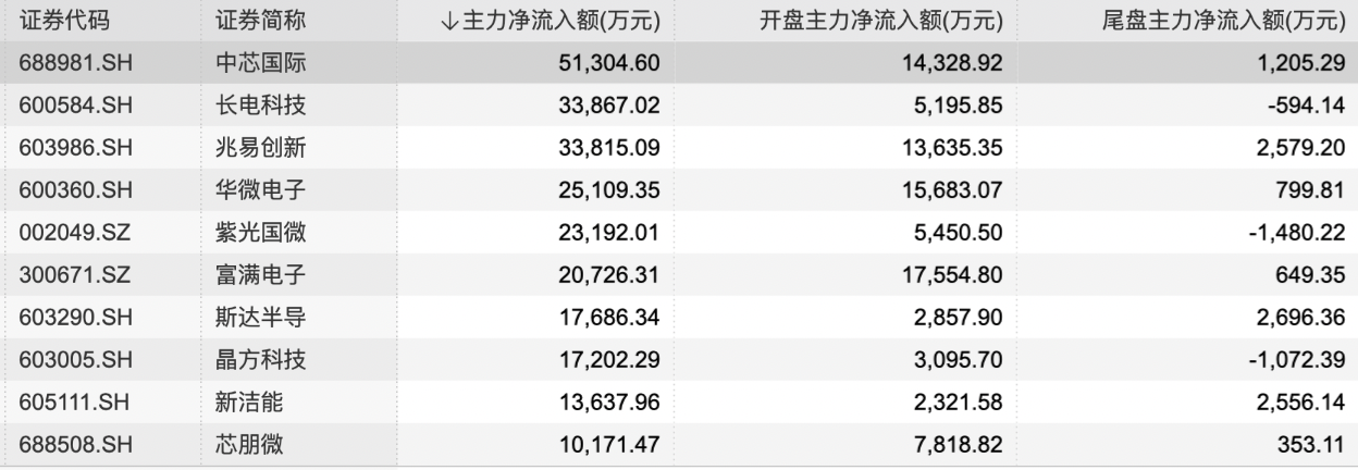 此前,有券商表示,科技成长将作为中报超预期的集中方向成为市场拉升主力,功率半导体等将成为中报超预期的密集方向。上半年收官,“夏日行情”开启,部分低位半导体股今日也获主力资金青睐,具体到个股来看,中芯国际获净流入5.1亿元,长电科技、兆易创新均获净流入3.4亿元。