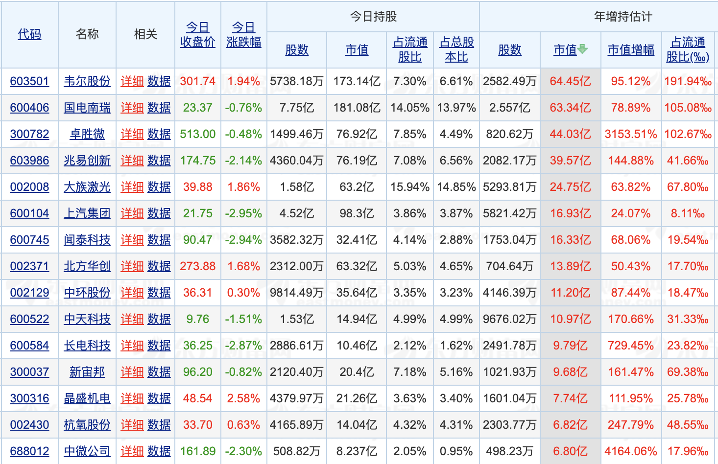 从资金流向来看,上半年,韦尔股份、国电南瑞、卓胜微分别获北向资金增持64.45亿元、63.34亿元、44.03亿元。