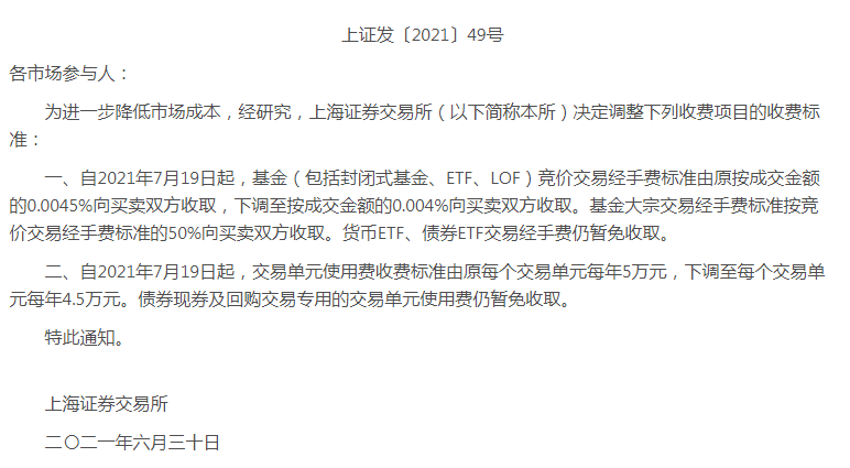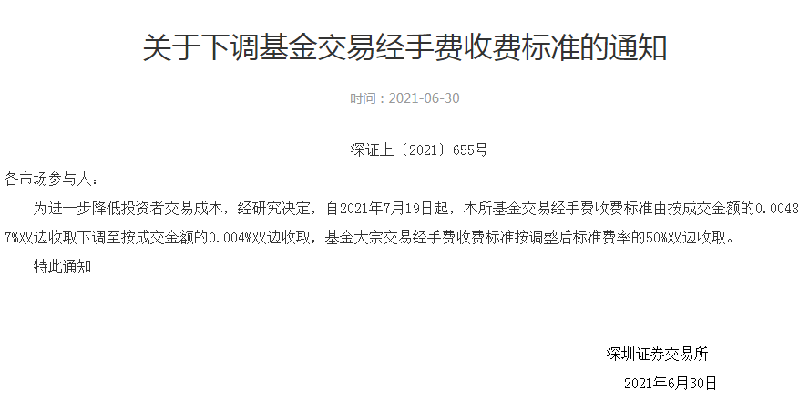 6月30日,沪深交易所相继发布通知,自2021年7月19日起,基金交易经手费收费标准下调至按成交金额的0.004%双边收取,基金大宗交易经手费收费标准按调整后的标准费率同步下浮,下浮幅度维持不变,即按竞价交易经手费标准的50%向买卖双方收取。
