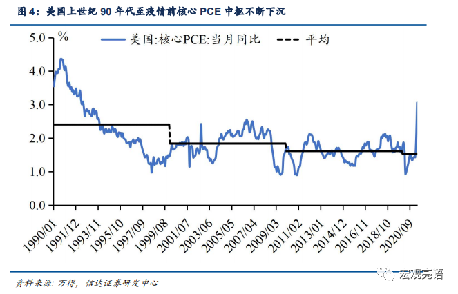 (1)长期的低通胀是弱化物价调控、提高通胀容忍度的根本原因。1990年以后,美国通胀率中枢持续下滑。1990—1999年、2000—2009年、2010—2019年美国核心PCE的平均值分别为2.41%、1.84%、1.61%(见图4)。2010年到2019年,仅仅有十分之一的时间通货膨胀率达到了2%的通胀率目标。