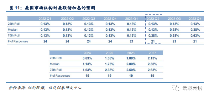第四,纽约联储统计了美国市场机构对美联储政策调整的预测。美联储以公开市场业务一级交易商为主要交易对手,以及交易商的筛选标准较为严格,主要为机构业务能力、市场表现、财务状况、监管合规、操作保障机制、内控制度以及提供市场信息和政策评估能力优秀的交易商,目前一级交易商数量仅23家,均为银行和券商类机构。如图11至13,是纽约联储统计的一级交易商的最新预测,美联储交易对手预计美联储从明年第一季度开始缩减购债,预计2023年的第二季度加息。不排除随着经济修复和预期上调,出现美联储加息提前至2022年底的可能。