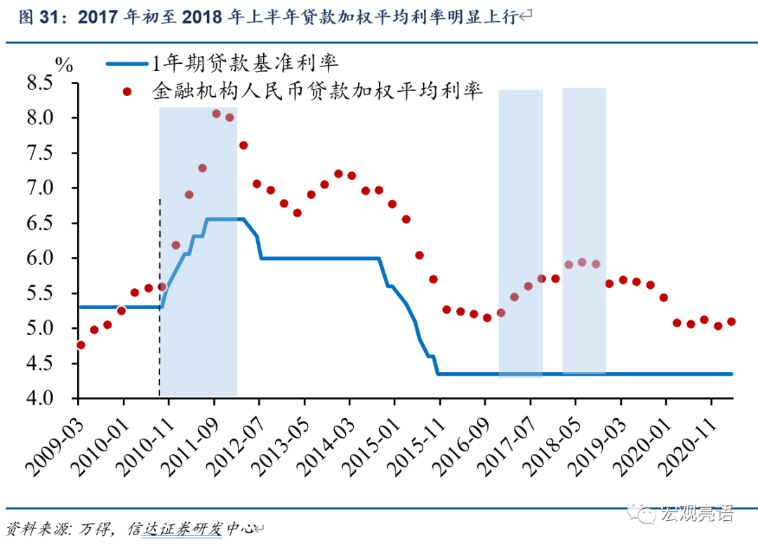 跟随美联储加息,市场利率上行,央行“随行就市”上调政策利率。2017年2月3日、3月16日、12月14日,美联储加息后,2016年底央行政策利率MLF均上调,前两次为10BP,第三次2018年3月为5BP,和美联储收紧的时间有一致性(见图30)。央行称,政策利率上行后,客观上有助于去杠杆、抑泡沫、防风险。该阶段,贷款加权平均利率也明显上行(见图31)。