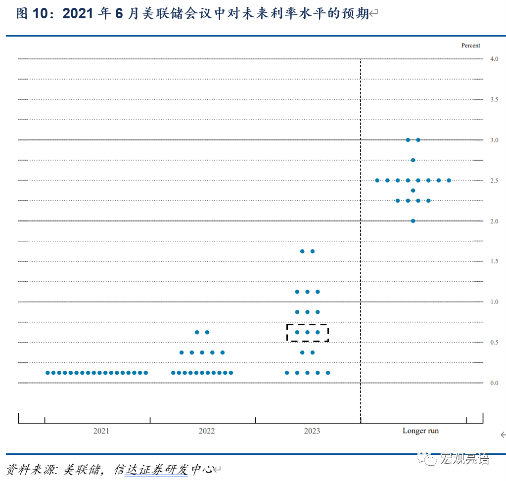 第三,随着经济预期上调,加息的时间点可能前移。6月会议上,美联储18个委员们对未来利率节奏预期的中位数有所前移(见图10,目前由点阵图来看,隐含的首次加息时点为2023年),为了应对近期流动性异常充裕,美联储此次还技术性上调了利率走廊的上下限IOER和RPR水平5BP,也显现了收紧意味。