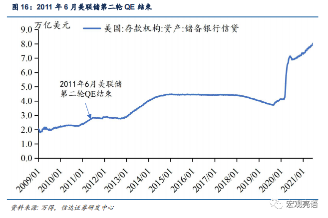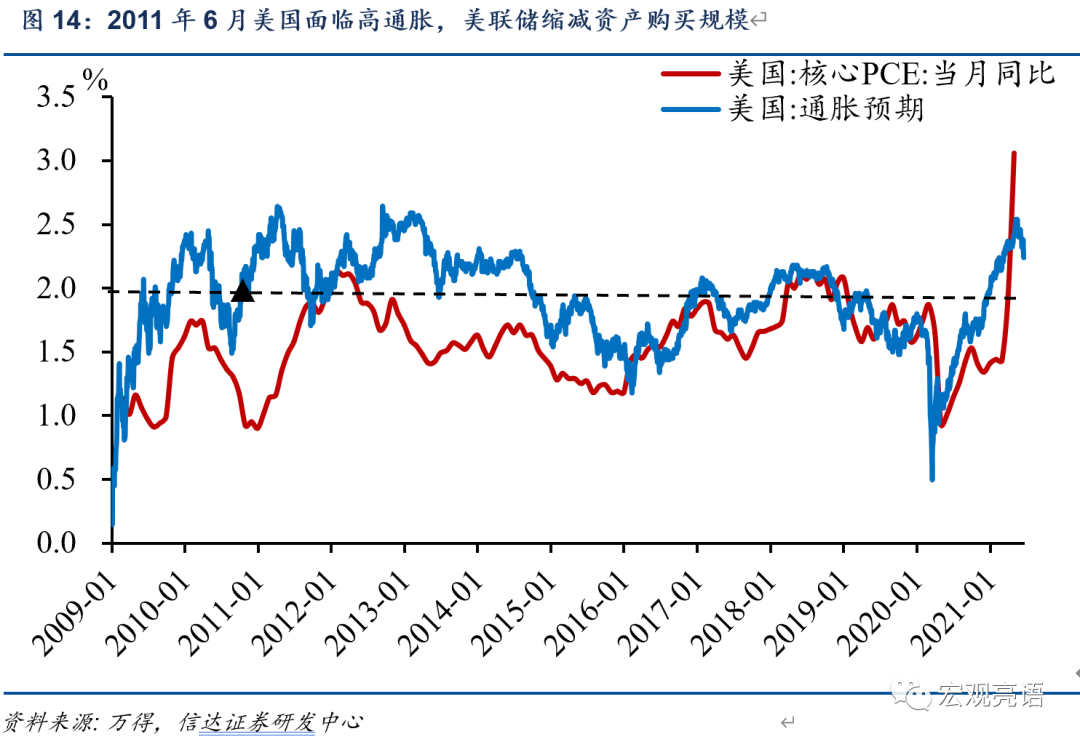 美国面临高通胀和高失业率,美联储加大了通胀容忍度,更加重视就业目标。2008年金融危机后,美国实施了第一轮量化宽松(2009年3月至2010年3月)后,2009年第三季度的美国GDP在金融危机连续四个季度下滑后首次出现正增长。但美国经济复苏仍然缓慢,为了刺激经济,美国从2010年11月至2011年6月进行了第二轮QE,每个月购买750亿美元的长期美债,其资产负债表规模再次扩张6000亿美元。类似2020年新冠疫情后,美国实施大规模的量化宽松来提振经济,此后通货膨胀预期越来越高,但是考虑到当时美国的失业率较高,美联储并未加息(见图15)。