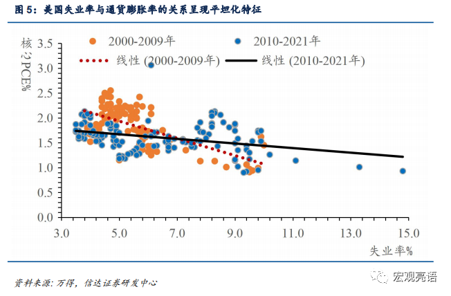 (2)菲利普斯曲线(失业率和通货膨胀负相关)失灵,通胀率对失业率不敏感,美联储强化就业支持。通胀率对失业率不敏感,致使美联储宽松的货币政策支持强劲的劳动力市场,而不引发高通胀。2000—2019年,美国失业率每下降1个百分点,通胀率仅上升0.087个百分点,二者的关系逐渐呈现平坦化特征(见图5)。通胀率对失业率不敏感,主要是因为薪资水平上涨向物价传导的渠道被弱化:强劲的劳动力市场未能大幅提升薪资水平。2019 年美国失业率已降至近50年以来的低位,劳动力市场强劲,但当年的时薪增长率仅为3%左右,低端岗位被科技进步替代、项目实行海外外包等,削弱了雇员的议价能力,降低了工资增幅。因此失业率下降,但是薪资水平没有上涨相应的幅度,薪资水平上涨并未传导到物价水平,因此通货膨胀未显现。