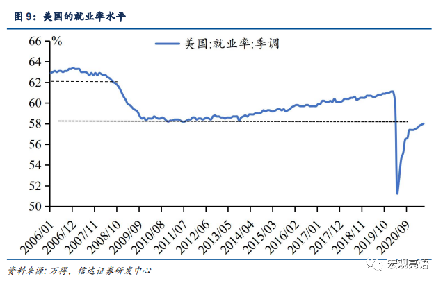 第二,更加照顾到实现充分就业水平。近期美联储依然强调,要等到经济修复进一步取得重大进展“substantial further progress”再行动。如果当下就业率以平均每月0.1个百分点的速度上行,恢复到疫情前的90%的水平或许更加充分,可能需6-9个月的时间,所以美联储很可能在明年的一季度缩减资产购买债券规模,讨论退出资产购买规模最早在今年的三季度。