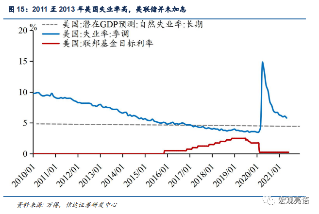 正如前文所陈述的观点,美联储不会突然大幅度收紧,会按照一定计划安排缓慢退出宽松政策,从讨论是否“开始讨论资产退出购买计划”——“退出资产规模购买计划”——“加息”,是一连串缓慢和有计划安排的收紧政策。此前2013年美联储退出资产购买计划,是在就业水平恢复到此前90%,通货膨胀在1.6%时进行。按照当下就业率每月增长0.1个百分点的速度,恢复到疫情前90%的水平,我们预计在6-9个月左右,因此我们可以得出结论,美联储缩减购买债券规模大概率是在明年的一季度。参照历史经验,讨论缩减购债一般会提前几个月,因此我们认为讨论退出资产购买规模最早在今年的三季度。