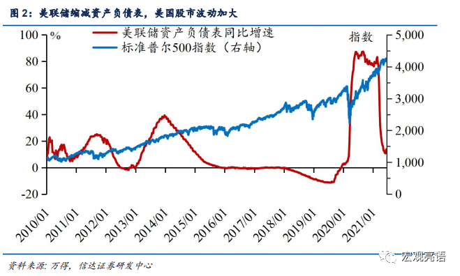 我们认为美联储今年上半年面临高通胀,迟迟不缩减资产购买规模,主要是由新的货币政策框架导致的,即把就业放在第一位,通货膨胀放在第二位。我们认为美国的通货膨胀并不是暂时的,很可能由于大宗商品上涨周期叠加经济复苏预期而持续一段时间。随着美国经济持续复苏,美联储终将开始讨论缩减购买债券规模。历史上,美联储收紧会加大美股以及房地产市场的波动(见图2),因此此次美联储大概率不会猛烈收紧,货币宽松政策的退出应该会缓慢以及有一定规划性地进行。美联储收紧货币政策,也会导致大量资本回流美国,新兴市场国家由于债务高企,很可能会遭遇本国资本流出而面临币值和金融市场风险。