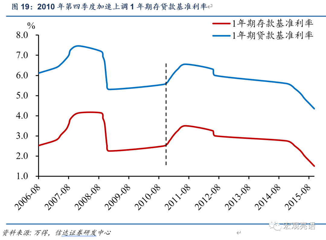 2010年四季度,央行上调存贷款基准利率,市场利率加快上行步伐。2010年10月22日,央行上调存贷款基准利率,此后截至2011年7月,几次上调存贷款基准利率(见图19)。贷款基准利率上调后,贷款加权平均利率也加速上升(见图18)。随后,2010年底,中央经济工作会议明确,货币政策基调从适度宽松转向稳健。