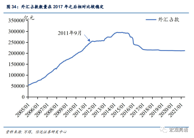 2017年以及此后的外汇占款几乎没有改变,因此我们认为此时间段后,外汇占款的影响较小(见图34)。