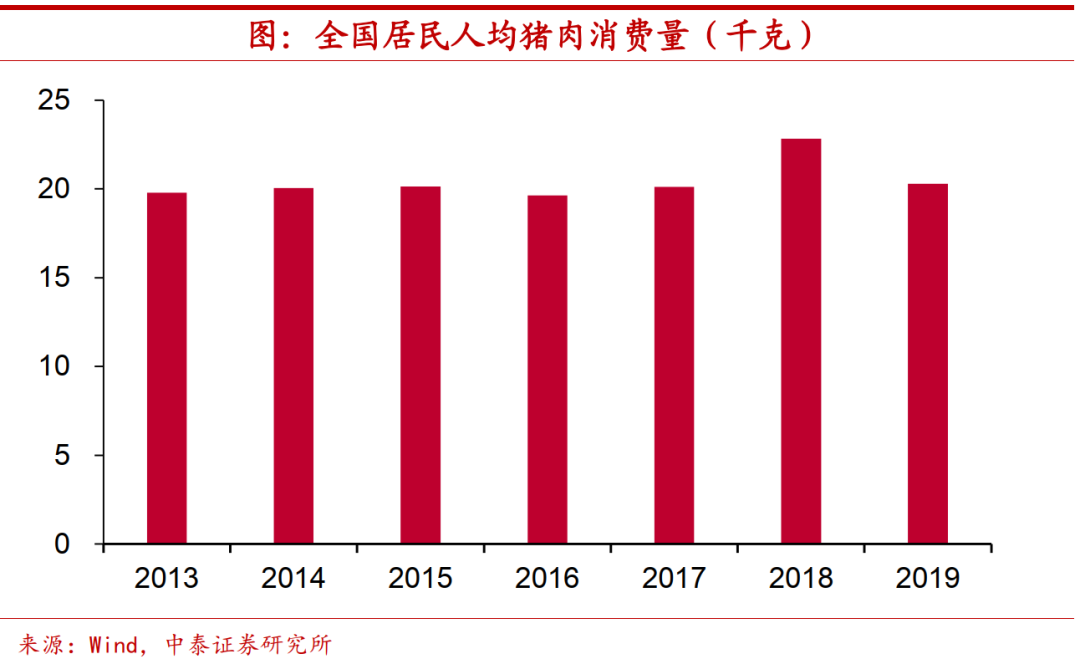 需求相对平缓。由于消费习惯基本稳定,因而居民对于猪肉需求的变化相对较为平缓,仅随季节改变表现出较大波动。2013年以来我国居民人均猪肉年消费量大体维持在每年20千克左右的水平,呈现平稳态势。