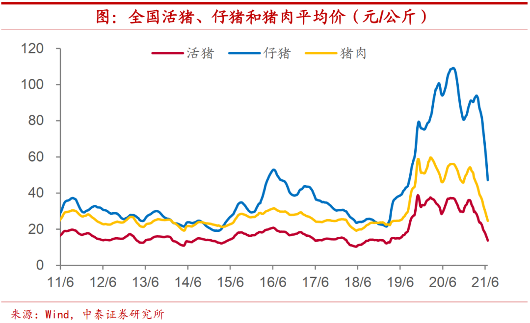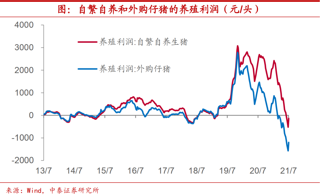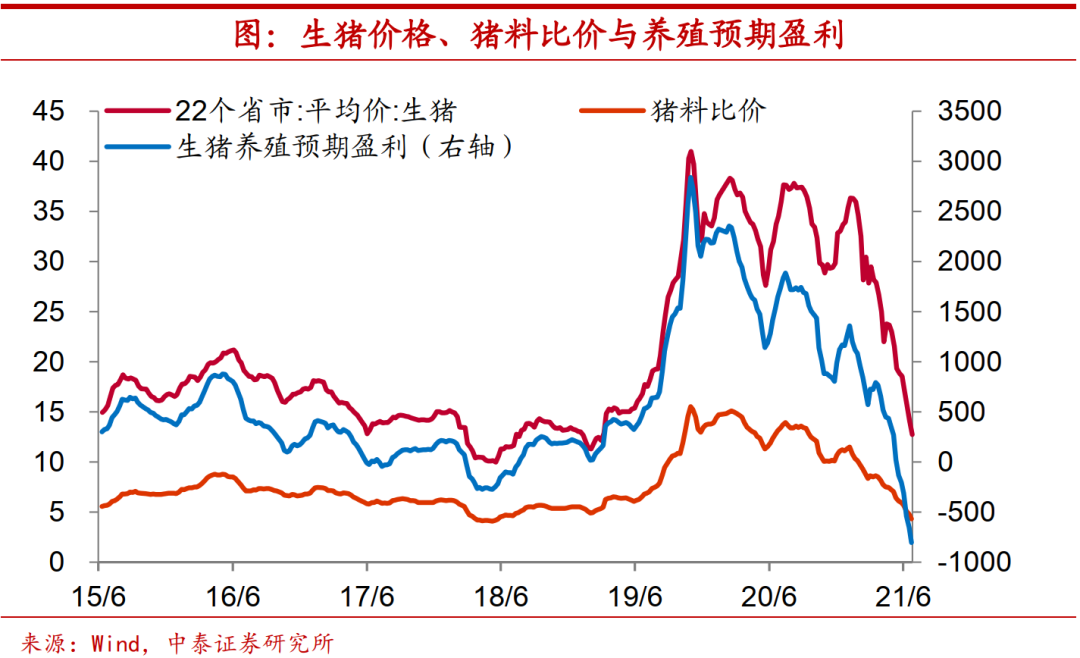 养殖利润转入亏损区间。最后,养殖利润已转入亏损区间。由于今年粮食价格的上涨,叠加猪价持续疲弱,5月中下旬猪粮比价已经降至6:1以下,显著低于国家发改委所披露的生猪生产达到盈亏平衡点的猪粮比价。5月中下旬以来生猪养殖预期盈利已经转入亏损区间,6月底预期亏损更是超过800元/头。而从历史经验上来看,生猪养殖预期盈利转为亏损,通常不久后猪价就会止跌回升。