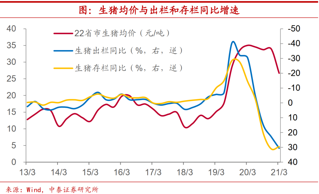 供给尤为充裕,拖累猪价走低。随着疫情等因素对供给端制约的逐渐消除,生猪出栏和存栏同比增速持续走高,反映出供给较为旺盛。自去年三季度以来,生猪出栏同比增速就维持在15%以上,今年1季度生猪存栏同比增速也维持在30%左右的高位。而春节消费旺季已过,供给相对需求较为充裕使得猪价跌势不止。