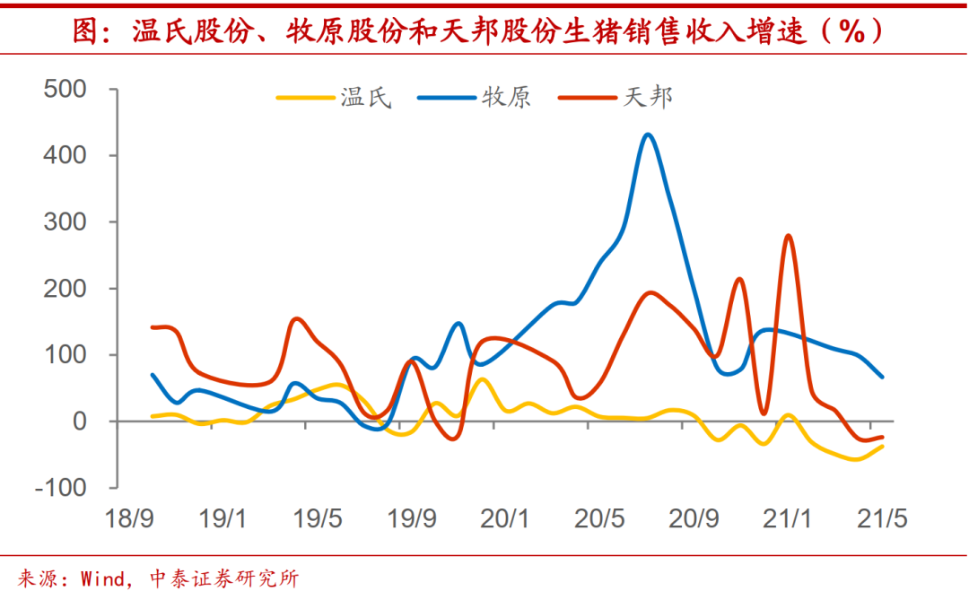 龙头企业收入增速走低。即便行业内的龙头企业,销售收入也步入了低增速乃至负增速阶段。在去年高基数效应的影响下,今年以来温氏股份、牧原股份和天邦股份生猪销售收入增速持续走低,其中温氏股份和天邦股份生猪销售收入已转入负增长。